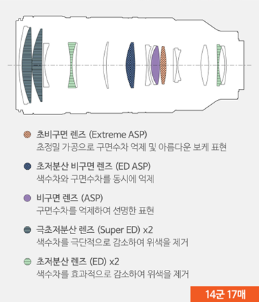 최상의 화질 표현 또한 가능한데요, 그 비결은 혁신적인 렌즈 구성에 있습니다. XA(eXtreme Aspherical) 렌즈 1매와 극초저분산 렌즈(Super ED) 2매를 적용하여 망원 렌즈에서 발생할 수 있는 각종 수차를 최소화했습니다. 이를 통해 크롭된 이미지도 선명하게 얻어낼 수 있죠. 또한 초점거리 200mm의 F2.8의 최대 개방 상태에서도 30라인 콘트라스트가 전구간 80% 이상으로 사진의 극주변부까지 뛰어난 해상력을 실현합니다.